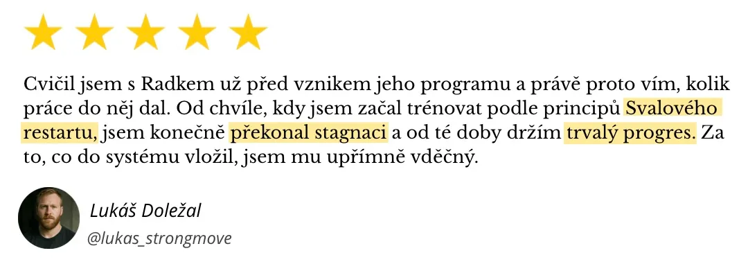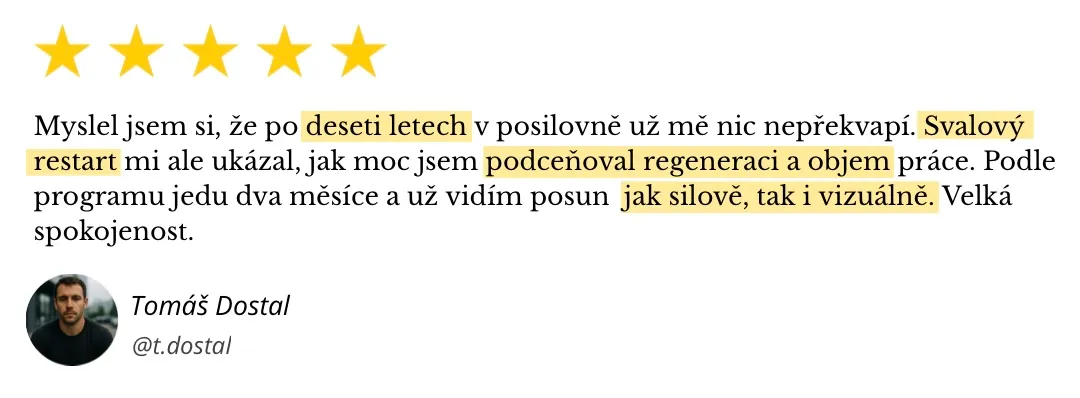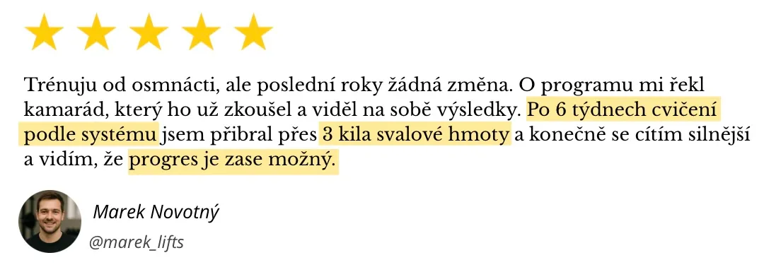 Konečně program, který dává smysl. Všechno do sebe zapadá. Trénink, regenerace i výživa. Po pár týdnech jsem začal cítit zlepšení v síle a konečně mám jistotu, že se posouvám správným směrem.