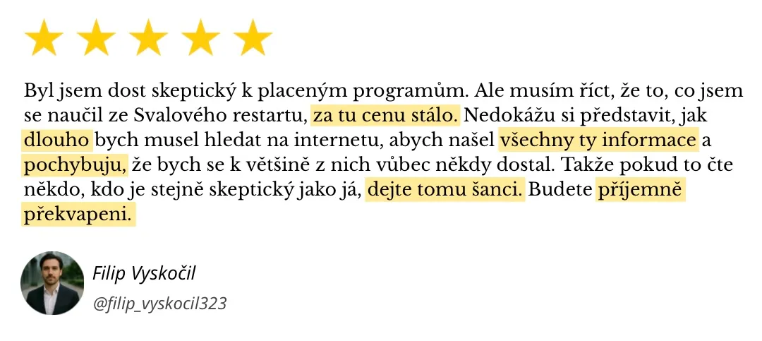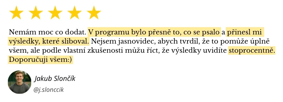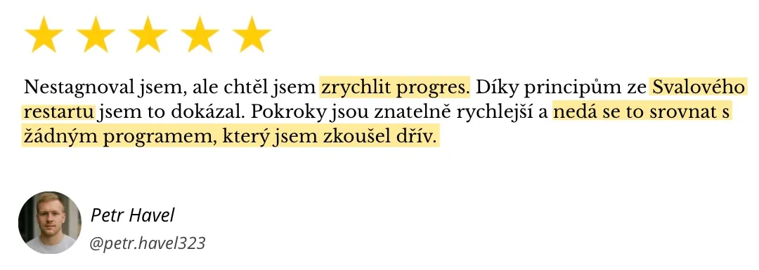 Nečekal jsem, že e-book může být takhle přínosný. Je to přehledné, má to logiku a hlavně výsledky. Doporučil bych to každému, kdo chce konečně pochopit, jak cvičit na sto procent.